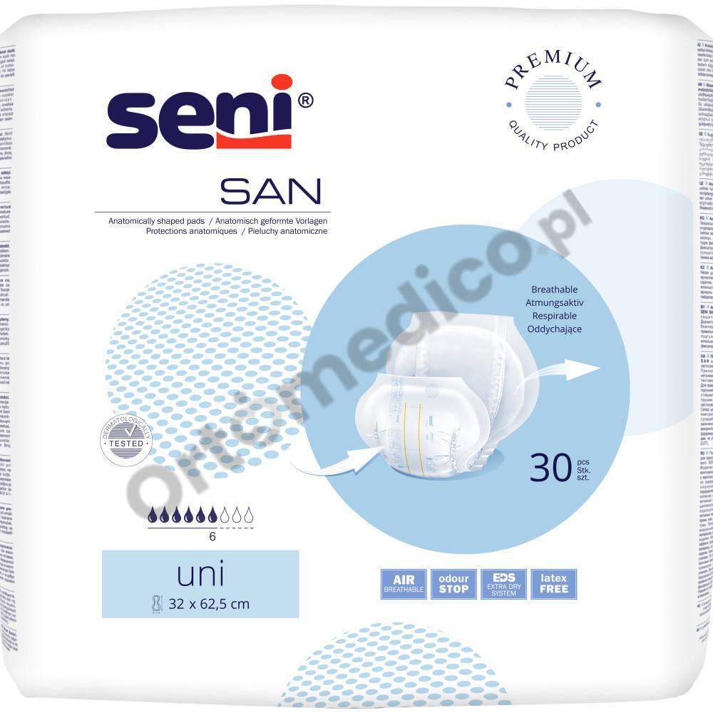 Pieluchy anatomiczne Seni San Uni przeznaczone są dla osób z średnim i ciężkim stopniem nietrzymania moczu. Przeznaczone zarówno dla osób aktywnych jak i dla tych o ograniczonej mobilności. Chłonność jaką posiadają te pieluchy to 6/9 kropelek.