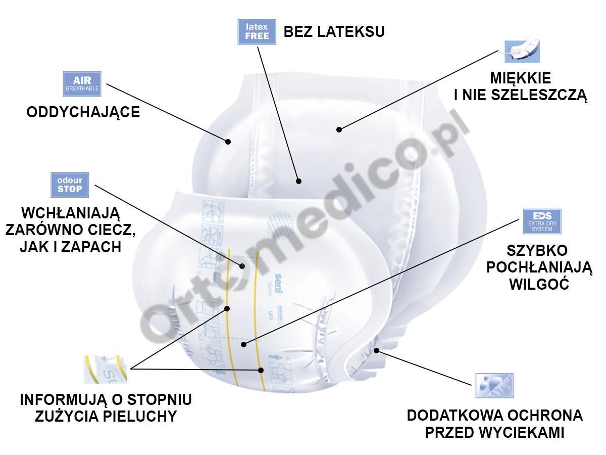 - Oddychalność - pieluchy anatomiczne Seni San są z materiałów przepuszczających parę wodną i uwalniających nadmiar ciepła, co pozwala skórze swobodnie oddychać