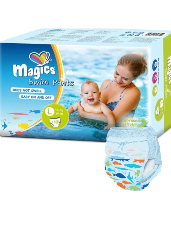 MAGICS Swimpants L to pieluchy kąpielowe stworzone z myślą o starszych dzieciach powyżej 14 kg, zwykle od około 2,5 do 4 roku życia. To świetny wybór dla dzieci, które potrzebują jeszcze dodatkowej ochrony, ale chcą uczestniczyć w zajęciach na basenie lub bawić się w wodzie podczas rodzinnych wakacji.