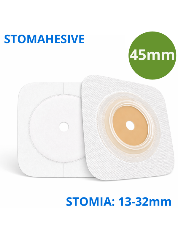 - Ochrona skóry przed treścią jelitową i moczem: Materiał Stomahesive® działa jako bariera, chroniąc skórę przed działaniem drażniących substancji.