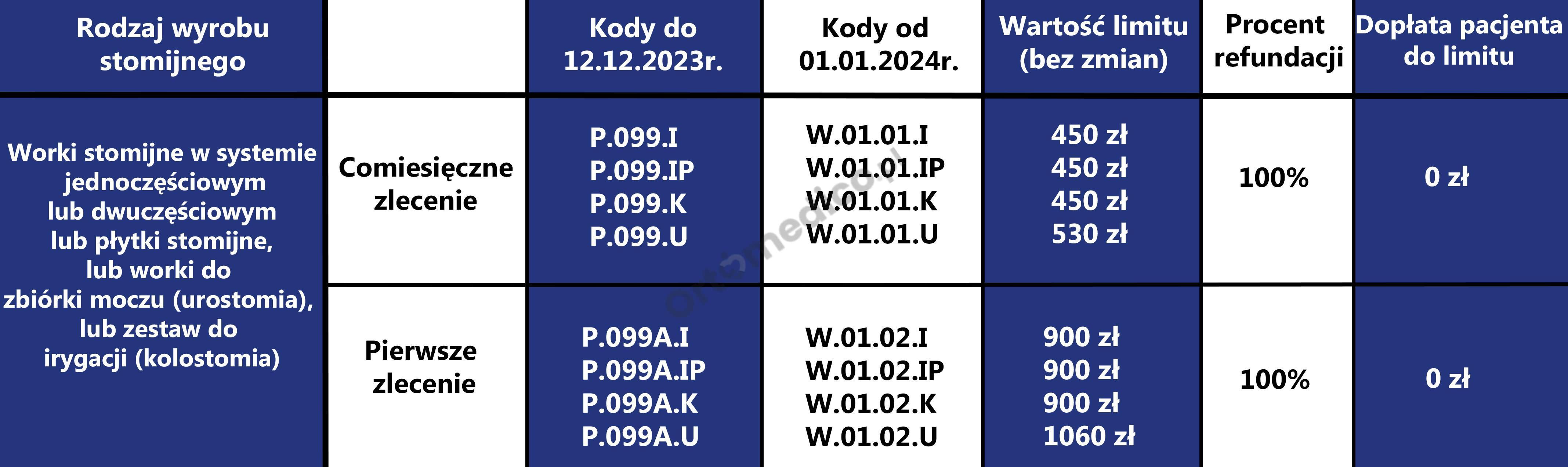 Od 1 stycznia 2023 roku zmianie uległa refundacja wyrobów stomijnych. Ustanowiono 2 zlecenia na sprzęt stomijny (P.99 worki i płytki i P.141 akcesoria) oraz osobne zlecenie (P.99.A, P.141.A) dla pacjentów nowo operowanych z podwójnym limitem. Podwyższono limity: w kolostomii i ileostomii do 450 zł ; w urostomii do 530 zł, akcesoria 120 zł w tym 20% dopłaty pacjenta. Wystawiający zlecenie będzie zlecał ryczałt lub jego część lub jego wielokrotność w przypadku pacjentów z 47ZN, 47ZND, 47DN.