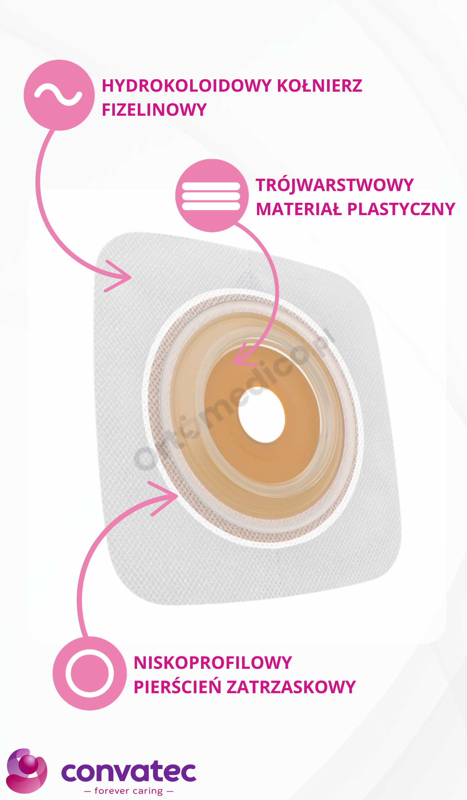 • Dopasowuje się do zmieniających się kształtów i rozmiarów stomii w ciągu dnia, zapewniając stabilność i szczelność.