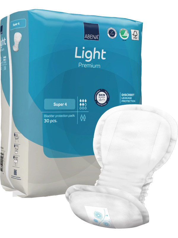| Abena Light Super 4 podpaski urologiczne dla kobiet | 850 ml | 44 x 20 | Oddychające, bardzo cienkie, system TopDry, kontrola zapachów, miękkie barierki boczne |