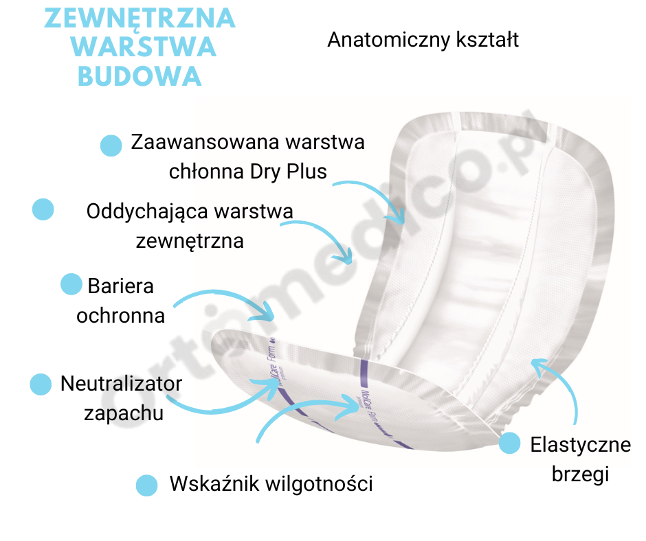 - Wkład chłonny jest pokryty włókniną Dry Plus, która oddziela skórę od wilgoci i pomaga utrzymać jej naturalne pH.