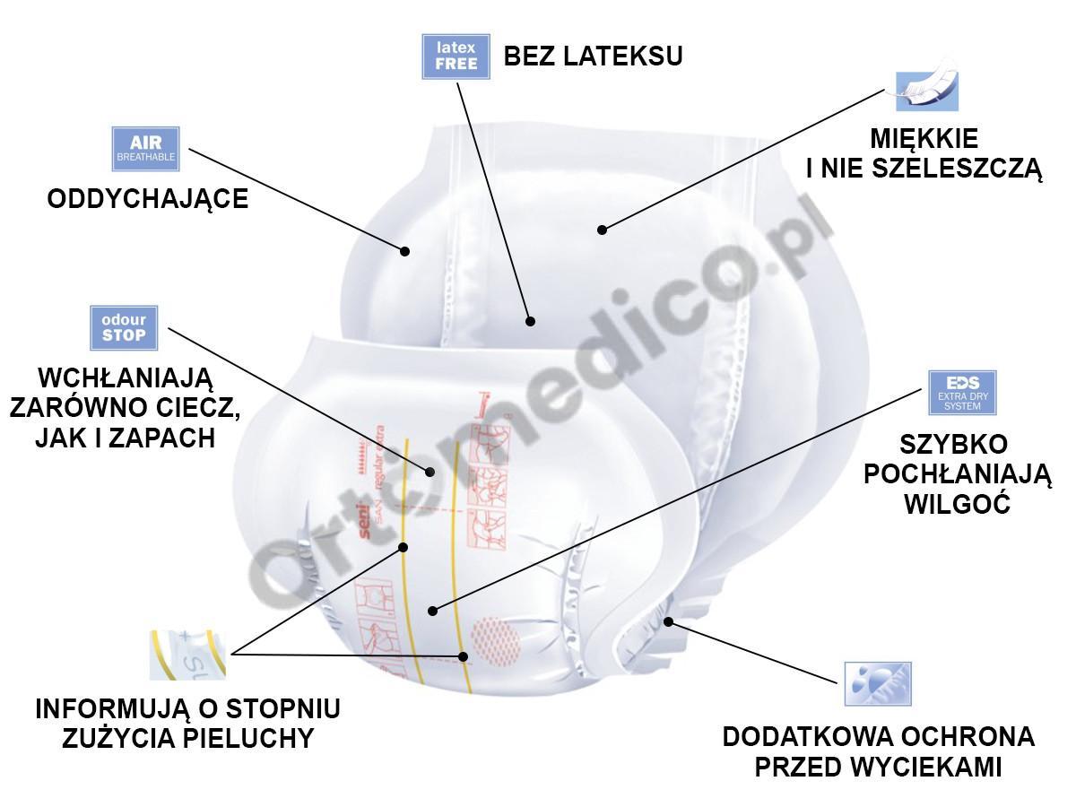 Pieluchy anatomiczne Seni San Regular Extra przeznaczone są dla osób z ciężkimi bardzo ciężkim stopniem nietrzymania moczu. Przeznaczone zarówno dla osób aktywnych jak i dla tych o ograniczonej mobilności. Chłonność jaką posiadają te pieluchy to 7,5/9 kropelek, dzięki czemu idealnie nadają się również na noc.