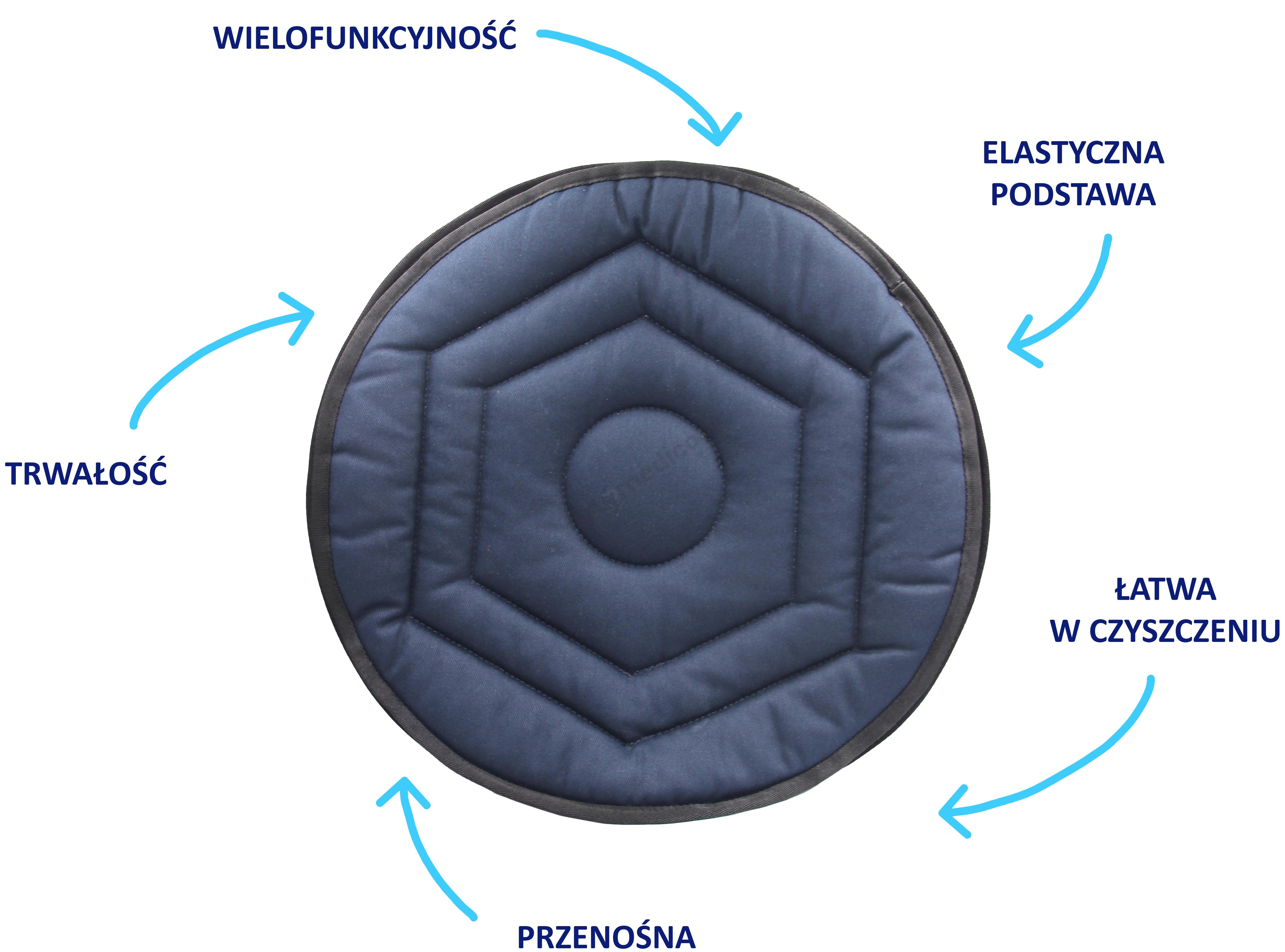 Elastyczna podstawa: Dopasowuje się do kształtu powierzchni, co zapewnia stabilność i komfort, niezależnie od miejsca użytkowania (krzesło, fotel, łóżko, samochód).