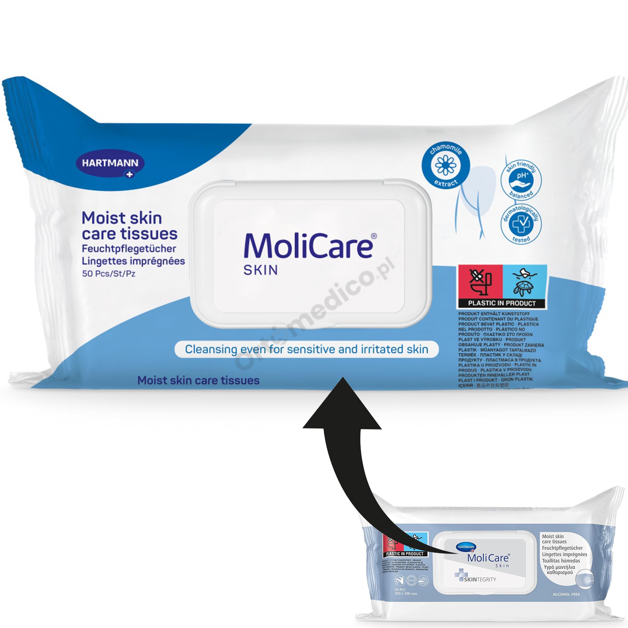 MoliCare Skin chusteczki przeznaczone do praktycznego, oszczędzającego czas oczyszczania skóry, szczególnie w przypadku nietrzymania moczu. Tolerancja dla skóry narażonej na działanie niekorzystnych czynników zewnętrznych. Chusteczki są miękkie i delikatne dzięki przyjaznym materiałom, posiadają neutralne pH dla skóry. Zawierają bezbarwny, delikatny płyn myjący. Posiada pH neutralne dla skóry.