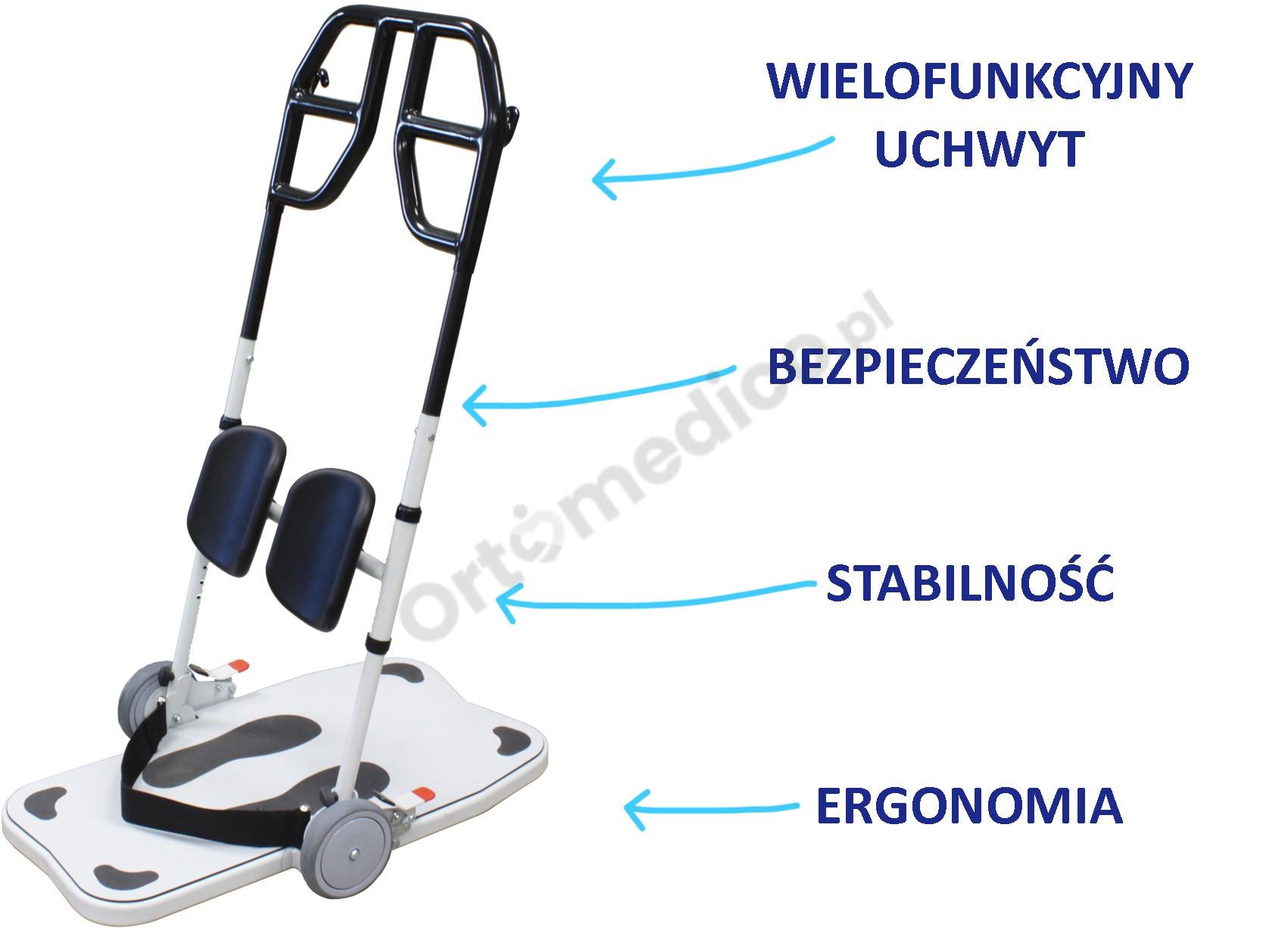 Przeciwwskazania: Pacjenci całkowicie niesprawni ruchowo, którzy nie mogą samodzielnie lub częściowo podnieść się do pozycji stojącej. Osoby z ciężkimi urazami kończyn dolnych, miednicy lub kręgosłupa, gdzie próba transferu mogłaby pogorszyć ich stan.