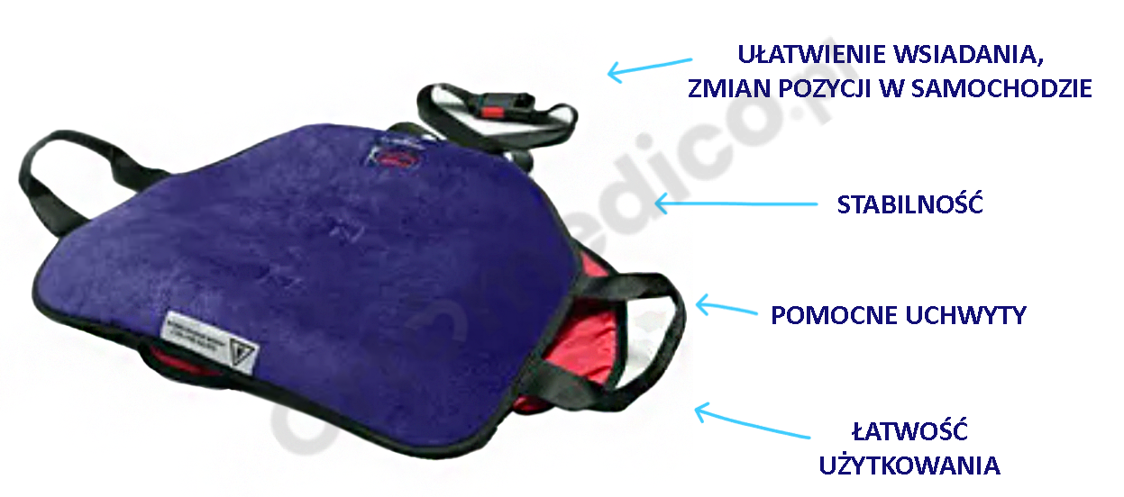 Wskazania: Podkładka  jest przeznaczona dla osób mających trudności z wsiadaniem do samochodu lub przyjmowaniem wygodnej pozycji na siedzeniu. Ułatwia obracanie się i przesuwanie na boki w trakcie jazdy, zapewniając większy komfort użytkowania.