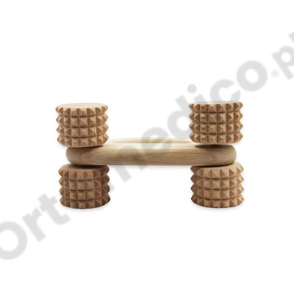 Posiada 4 wałki masujące z wypustkami, które swobodnie się poruszają nie stawiając oporu podczas użytkowania. Wyposażony w uchyt, który dodatkowo ułatwia wykonanie masażu również w sposób samodzielny.