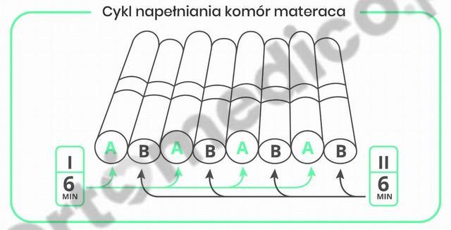 ➡️ materac zbudowany jest z 18 komór, które naprzemiennie w 12 minutowym cyklu, napełniają się naprzemiennie, po 6 minut każdy