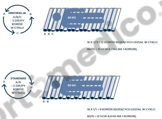 W czasie cyklu pracy, pompowane są 2 grupy komór, co oznacza, że 12 z 18 komór bierze udział w cyklu pracy materaca.