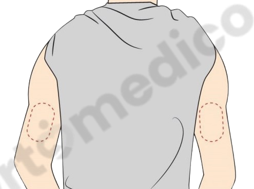 Tylna część ramienia. Unikaj miejsc z bliznami, znamionami, rozstępami. Zakładaj co najmniej 5 cm od miejsca wstrzyknięcia insuliny.