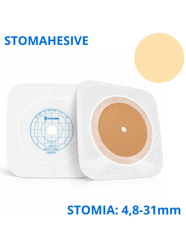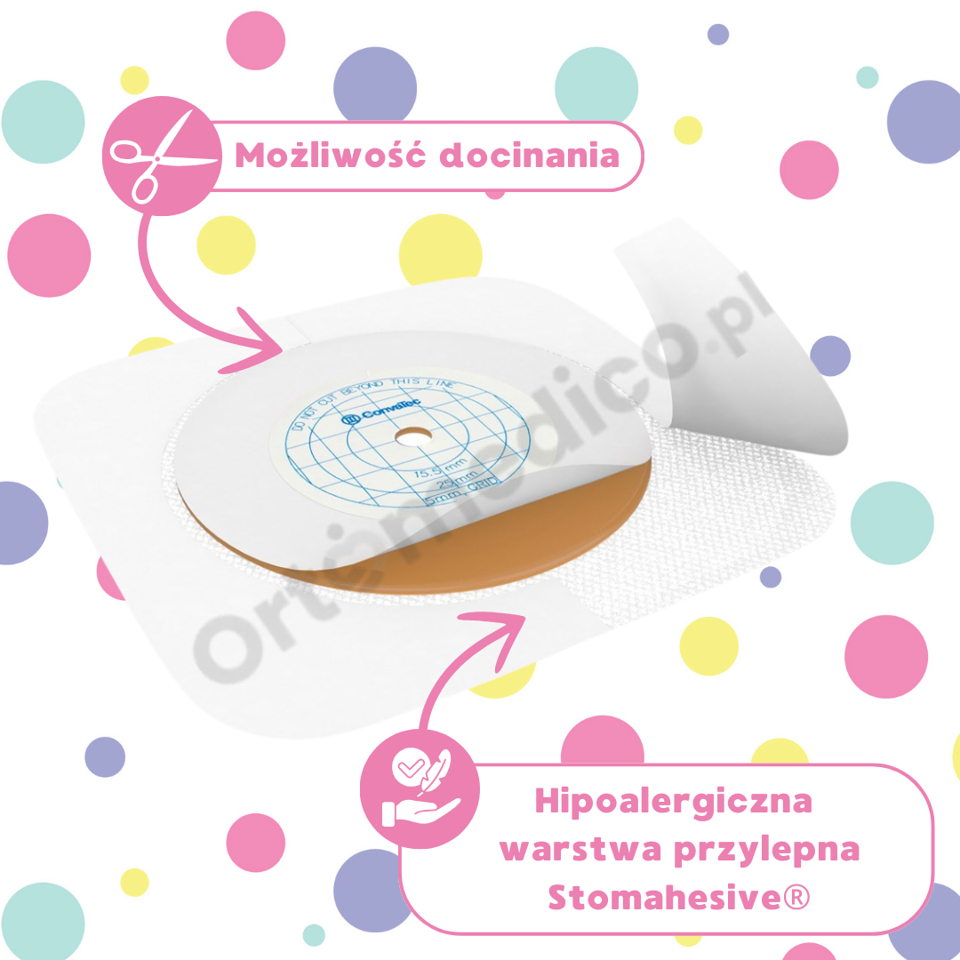 • Centralna część płytki wykonana jest z hipoalergicznego materiału Stomahesive®, który chroni skórę wokół stomii przed podrażnieniami i ewentualnymi zakażeniami, minimalizując ryzyko uszkodzeń.
