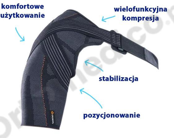Główne funkcje ortopedyczne obejmują stabilizację stawu barkowego, zabezpieczenie oraz kompresję. Prawidłowo zaaplikowana orteza generuje efekt elewacji kończyny górnej, jednocześnie odciążając struktury stawu barkowego. Dodatkowo, wspomaga poprawę propriocepcji.