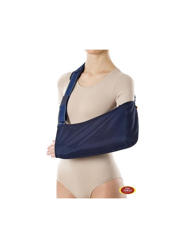Rękę należy umieścić w zagłębieniu temblaka a kciuk, umieścić w przeznaczonym do tego otworze. Przełożyć taśmę przez zdrowe ramię i dopasować długość za pomocą regulowanego zapięcia na rzep a miękką osłonę umieścić na szyi.