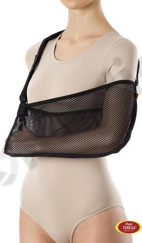 Rękę należy umieścić w zagłębieniu temblaka a kciuk, umieścić w przeznaczonym do tego otworze. Przełożyć taśmę przez zdrowe ramię i dopasować długość za pomocą regulowanego zapięcia na rzep a miękką osłonę umieścić na szyi.