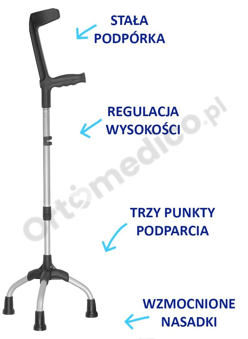 Stabilność i bezpieczeństwo - trzy punkty podparcia zapewniają stabilność, nawet na nierównych powierzchniach, co zwiększa poczucie pewności podczas chodzenia. Wzmocnione nasadki z podkładką stalową są odporne na ścieranie i gwarantują trwałość.