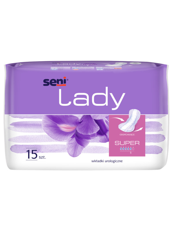 Wkładki urologiczne Seni Lady Super przeznaczone są dla kobiet z średnim stopniem nietrzymania moczu. Przeznaczone dla kobiet prowadzących aktywny tryb życia, mobilnych. Chłonność jaką posiadają te wkładki to 5/6 kropelek i wymiar 18 x 37 cm.