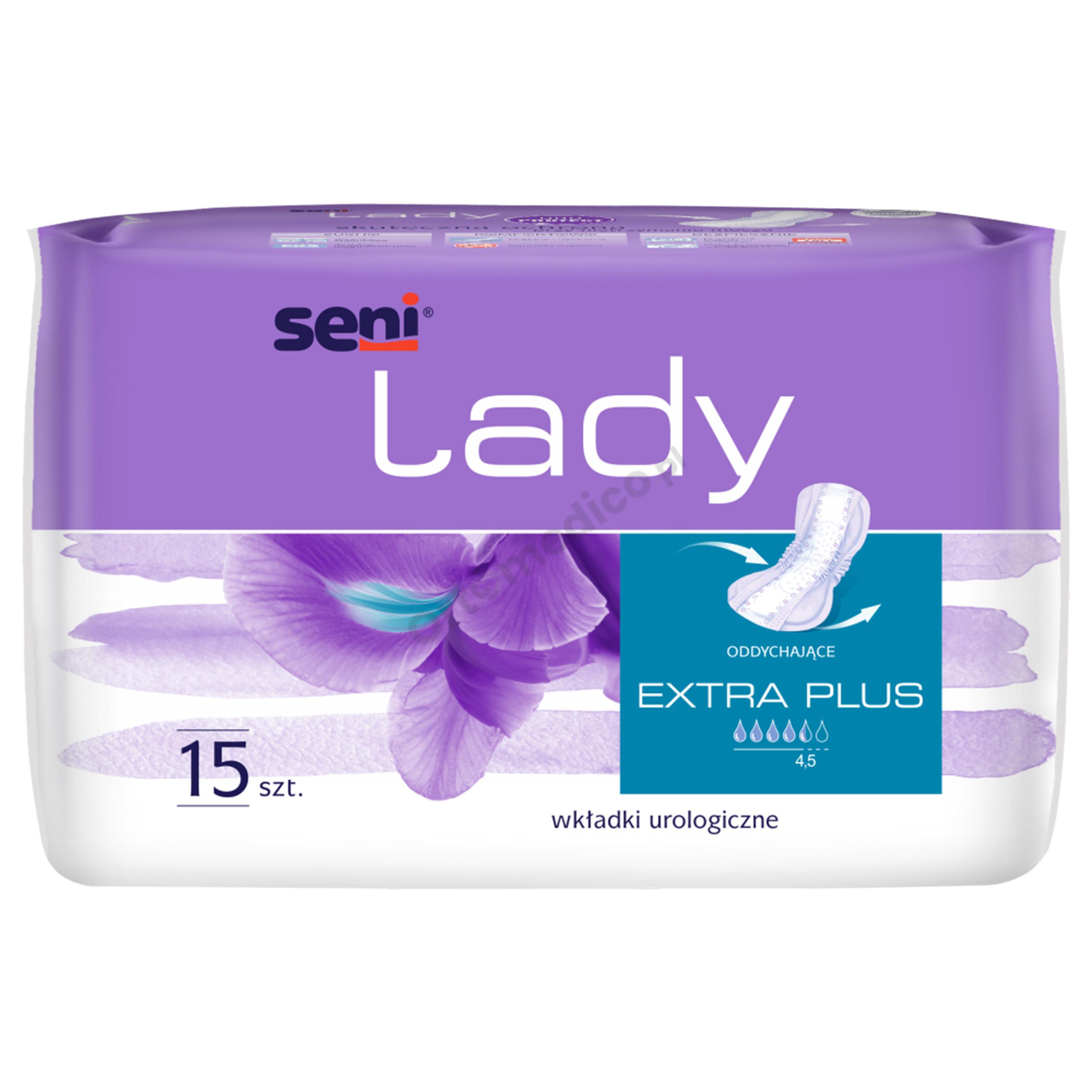 Wkładki urologiczne Seni Lady Extra Plus przeznaczone są dla kobiet z lekkim stopniem nietrzymania moczu. Przeznaczone dla kobiet prowadzących aktywny tryb życia, mobilnych. Chłonność jaką posiadają te wkładki to 4,5/6 kropelek i wymiar 15 x 33 cm.