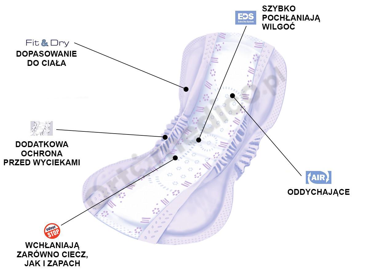 - Fit & Dry posiada anatomiczny kształt poprzez zwężenie wkładu chłonnego w kroku oraz przeniesienie masy chłonnej do części środkowej, czyli tam gdzie najbardziej liczy się chłonność
