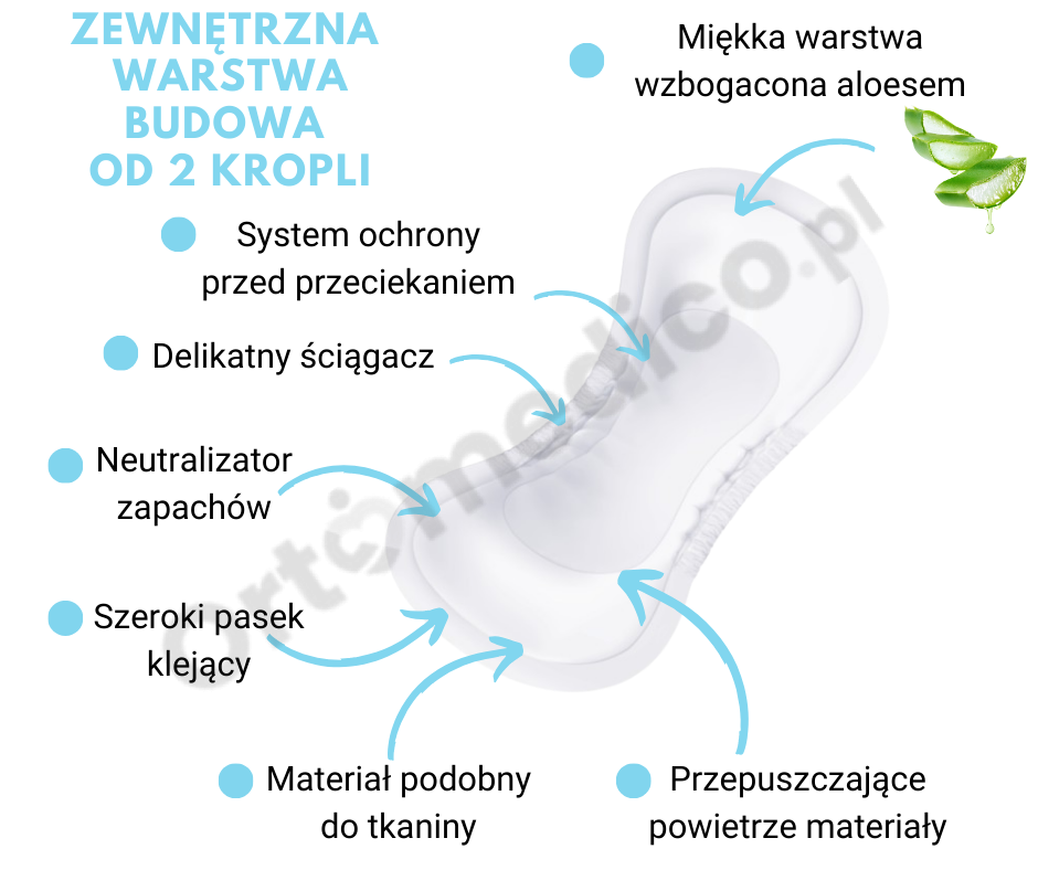 • Miękka, górna warstwa wzbogacona aloesem koi skórę i zapobiega podrażnieniom, wspierając jej regenerację.