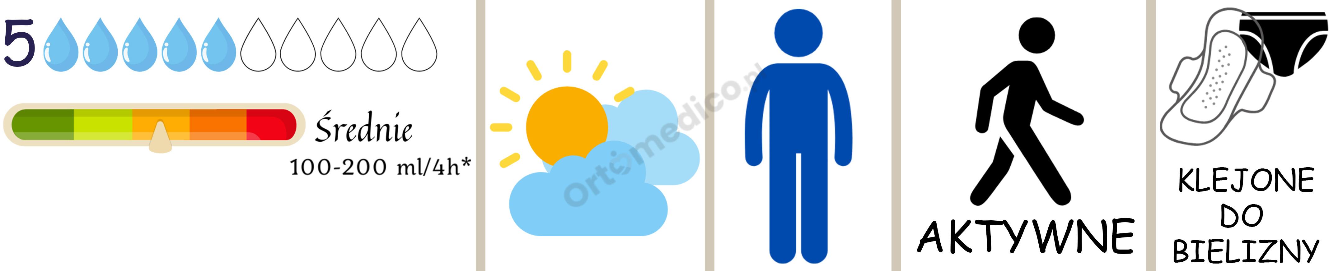 - Poziom chłonności 5.0 krople został opracowany z myślą o lekkim i średnim nietrzymaniu moczu, zapewniając niezawodną ochronę przez cały dzień.