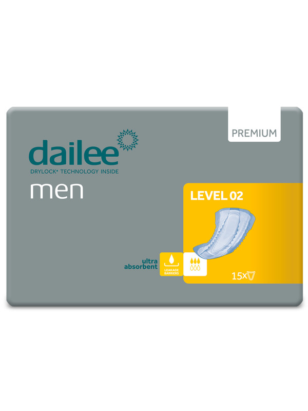 Dailee Men są anatomicznie zaprojektowane, aby pasowały dyskretnie, dzięki bezpiecznemu dopasowaniu wkładek. Dailee Men Level 2 są idealne dla mężczyzn aktywnych z problemem lekkiego nietrzymania moczu. Chłonność jaką posiadają te wkładki to 3/6 kropelek (612 ml).
