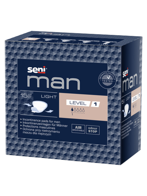 Wkładki chłonne Seni Man Light Level 1 przeznaczone są dla aktywnych mężczyzn, którzy potrzebują pewnej ochrony przed niewielkimi przeciekami moczu. Seni Men oferuje mężczyznom w każdym wieku skuteczną kontrolę nad nietrzymaniem moczu. Chłonność jaką posiadają te wkładki to 1/5 kropelek.