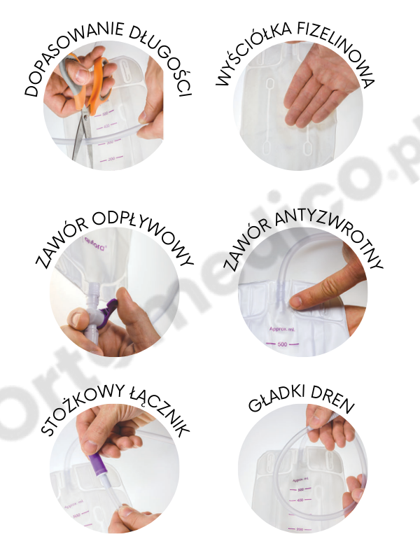 Zapobiega efektowi „balonowania”, równomiernie rozprowadza mocz i tłumi dźwięki przelewania się płynu. Worek jest praktycznie niewidoczny pod ubraniem.