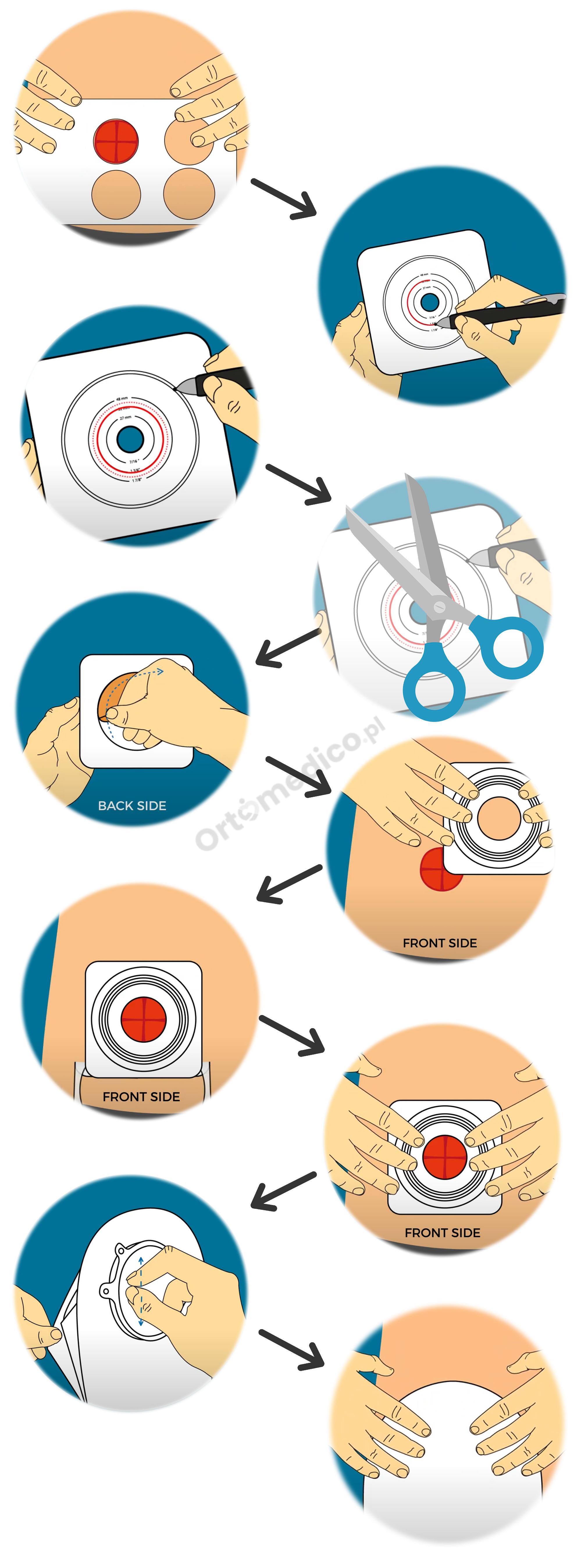 1.       Przygotuj płytkę. Zmierz stomię i odrysuj kształt na folii zabezpieczającej. Wytnij odrysowany kształt. PAMIĘTAJ między wyciętą krawędzią a pierścieniem zatrzaskowym zostaw minimum 1 cm !