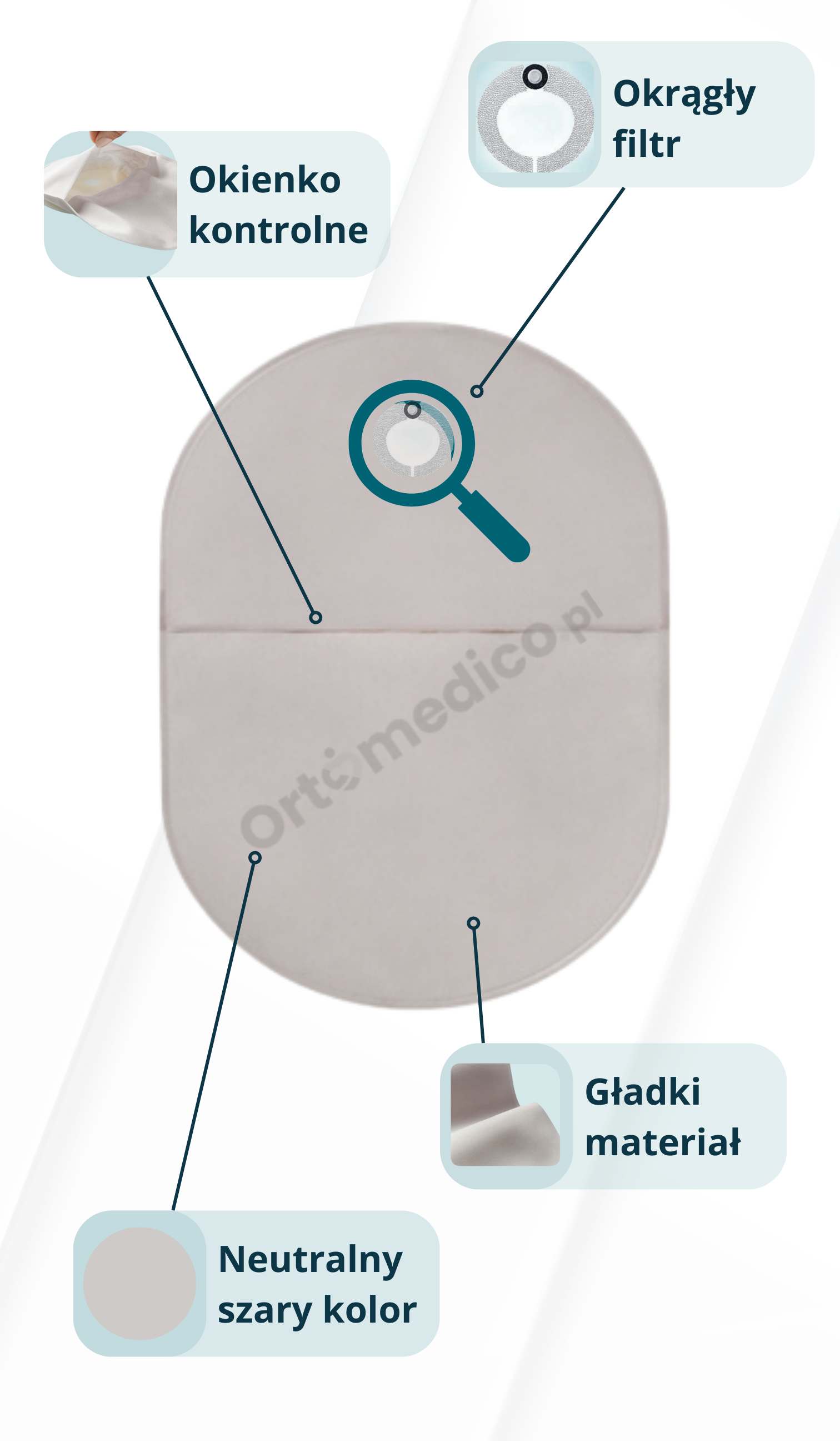 - Dla pacjentów oczekujących dyskrecji i wygody, dzięki neutralnemu, tekstylnemu materiałowi worka i systemowi Click.