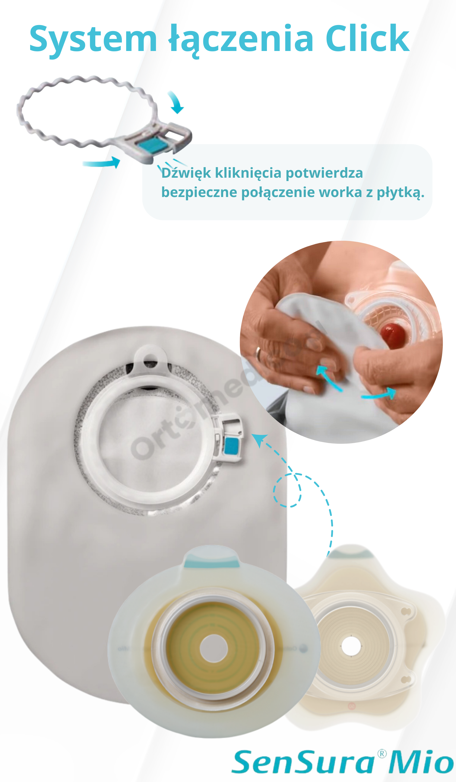 System Click to nowoczesne mechaniczne łączenie, które zapewnia szczelne i stabilne połączenie worka z płytką stomijną. Wystarczy delikatne dociśnięcie, by usłyszeć charakterystyczne „kliknięcie” potwierdzające prawidłowe zamocowanie