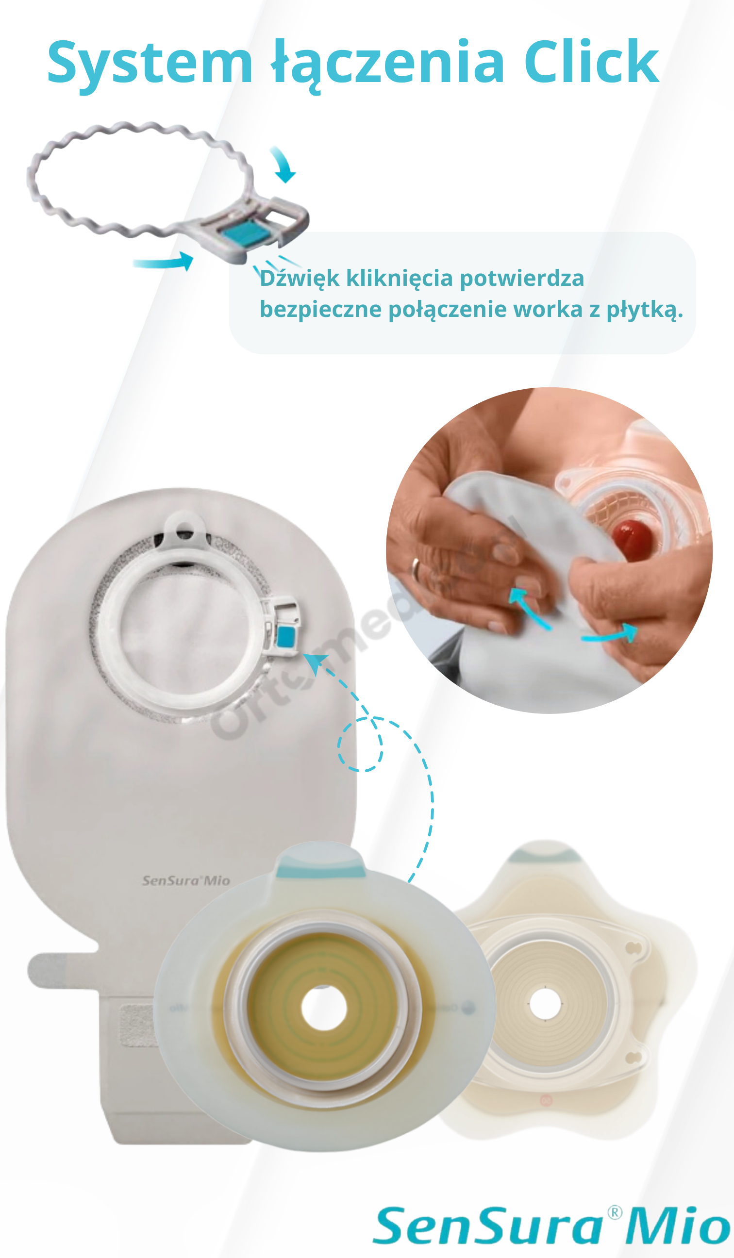 SenSura Mio Click to system dwuczęściowy, w którym płytkę stomijną można nosić przez kilka dni, a worek wymieniać częściej. Dzięki łączeniu mechanicznemu Click użytkownik ma pewność szczelnego zamocowania – potwierdza to charakterystyczne „kliknięcie”. Dodatkowo, worek można swobodnie obracać na płytce przed jego zablokowaniem, aby ustawić go w najbardziej komfortowej pozycji.