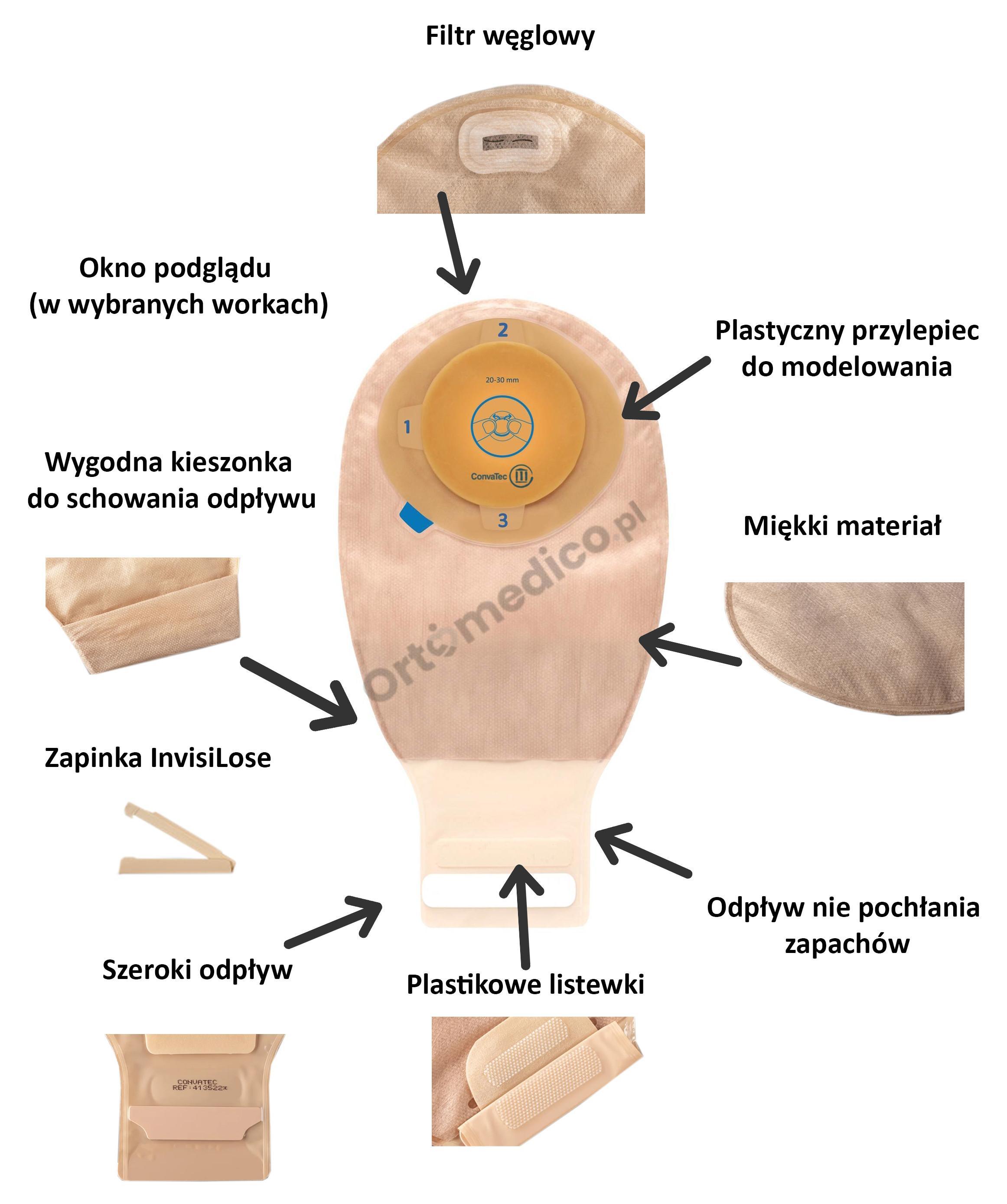 Jest on elastyczny i cienki daje to uczucie komfortu w trakcie noszenia. Materiał przylepca został wykonany z materiały Stomahesive przyjaznego dla skóry. Dodatkowo w worku zastosowano nowoczesną zapinkę InvisiClose przezroczystym, który zabezpiecza przed przeciekaniem worka. Wyjątkowo delikatny i miękki materiał worka, pozwala na oddychanie skóry, wpływa to na zwiększenie komfortu i bezpieczeństwa pacjenta.