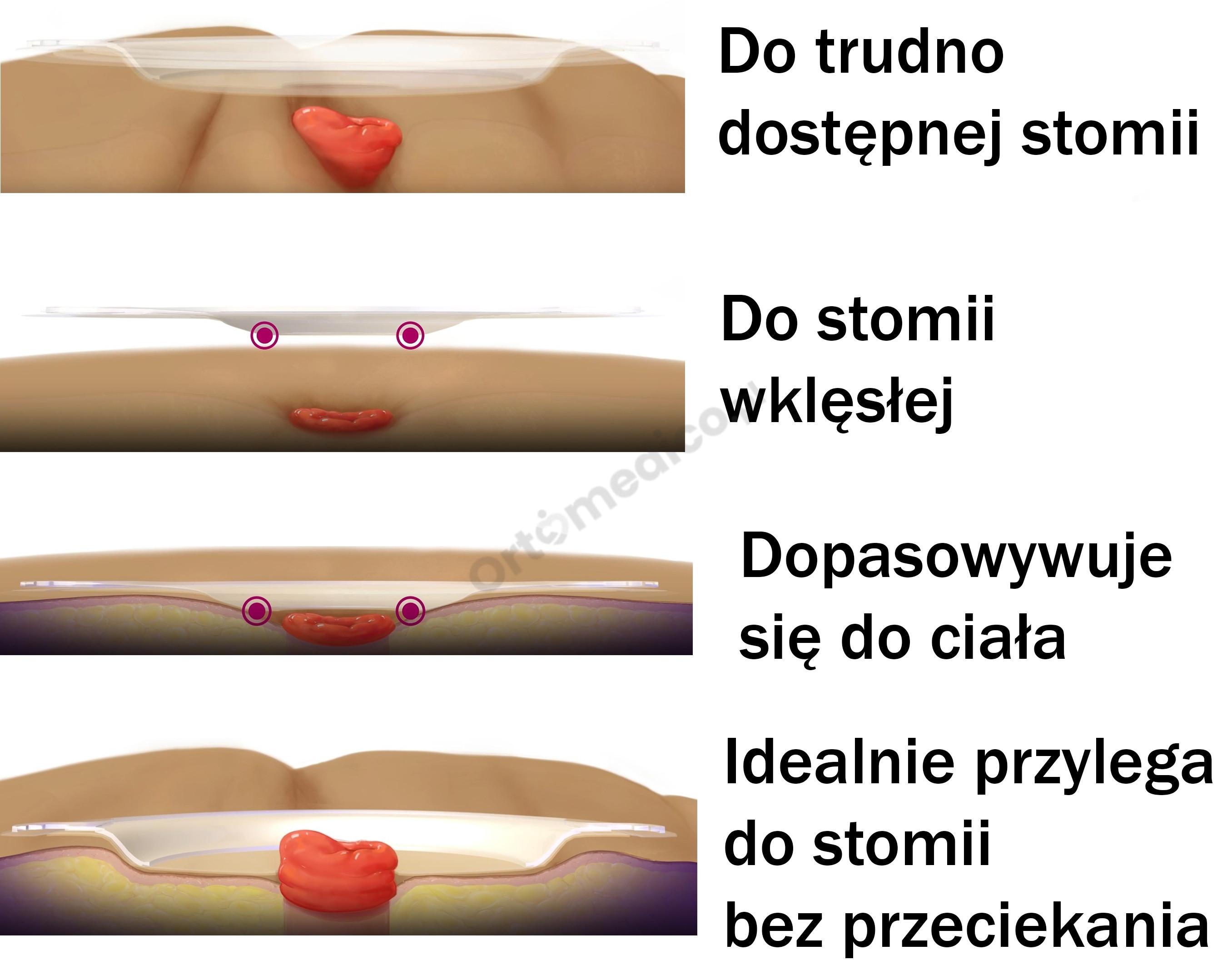 2. Płaska lub wklęsła stomia: Produkt jest idealny dla pacjentów z płaską, wklęsłą lub cofniętą stomią, gdzie tradycyjne worki mogą nie zapewniać wystarczającego uszczelnienia.