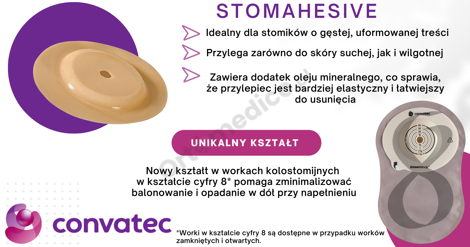 Hydrokoloidowy przylepiec Stomahesive® – Miękki, elastyczny przylepiec, który chroni skórę wokół stomii i zapewnia bezpieczne, długotrwałe przyleganie. Dostępny w dwóch głębokościach (3,5 mm i 7 mm), aby dopasować się do indywidualnych potrzeb pacjentów z różnymi typami stomii.