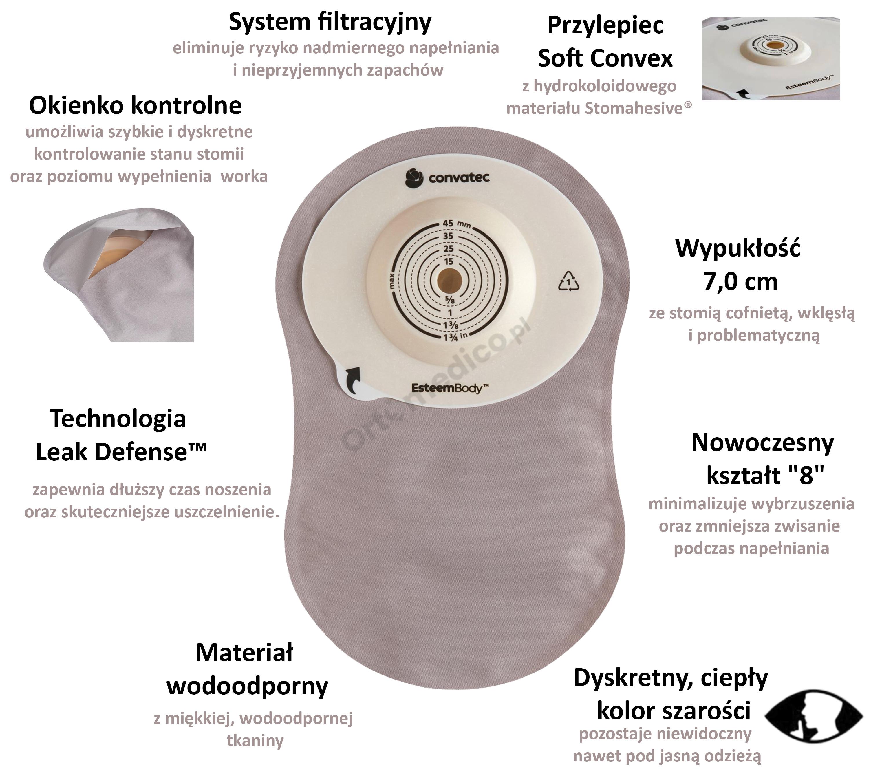 Esteem Body™ Soft Convex to innowacyjny produkt, który wyznacza nowe standardy w opiece nad pacjentami z kolostomią. Zaprojektowany z myślą o osobach z płaską, wklęsłą lub problematyczną stomią, zapewnia maksymalne bezpieczeństwo i komfort w codziennym użytkowaniu. Dzięki swojej inteligentnej konstrukcji, zaawansowanym materiałom i innowacyjnej technologii ochrony skóry, worek ten oferuje niezrównane rozwiązania, które znacznie podnoszą jakość życia pacjentów stomijnych.
