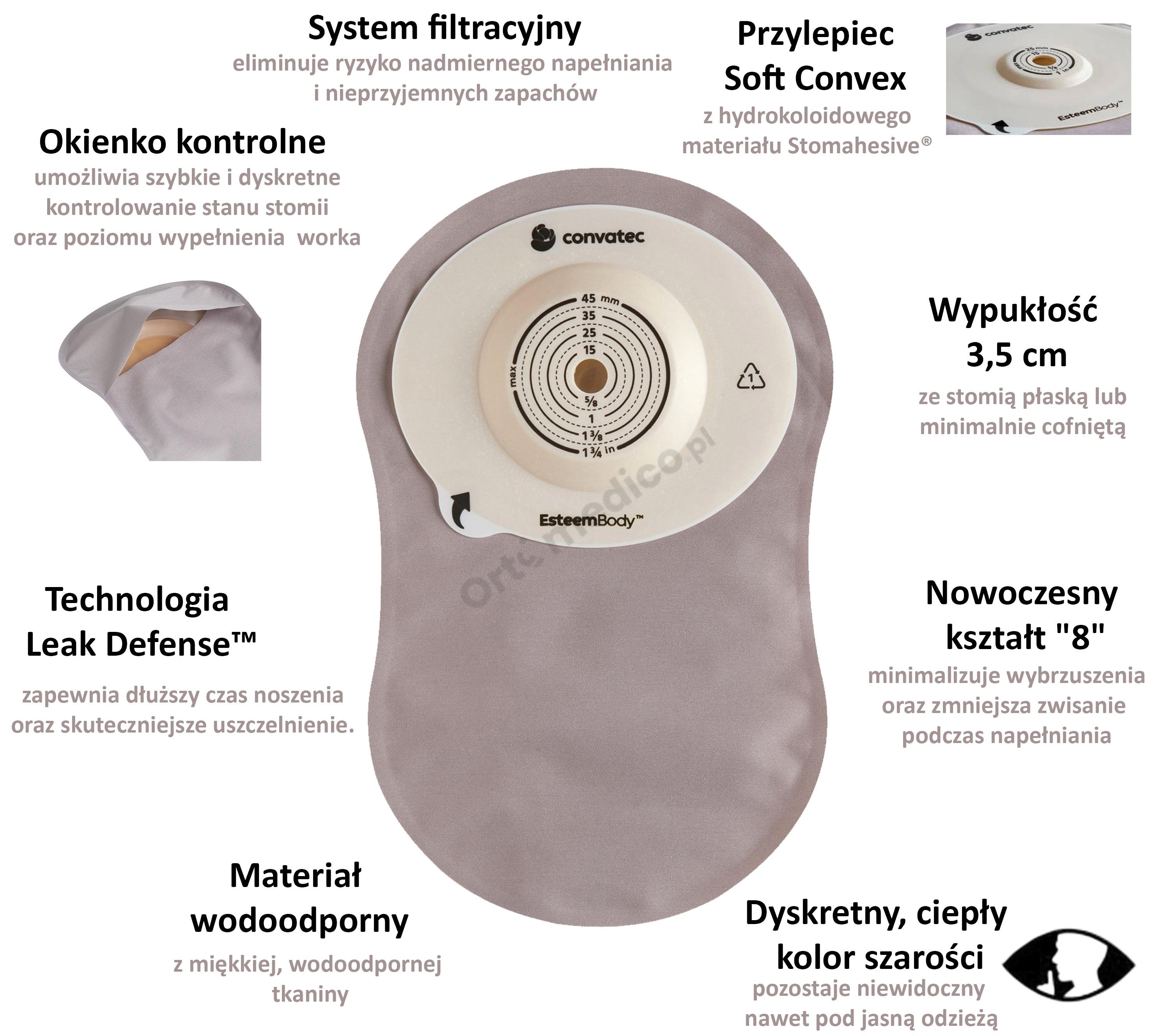 Esteem Body™ Soft Convex to innowacyjny produkt, który wyznacza nowe standardy w opiece nad pacjentami z kolostomią. Zaprojektowany z myślą o osobach z płaską, wklęsłą lub problematyczną stomią, zapewnia maksymalne bezpieczeństwo i komfort w codziennym użytkowaniu. Dzięki swojej inteligentnej konstrukcji, zaawansowanym materiałom i innowacyjnej technologii ochrony skóry, worek ten oferuje niezrównane rozwiązania, które znacznie podnoszą jakość życia pacjentów stomijnych.