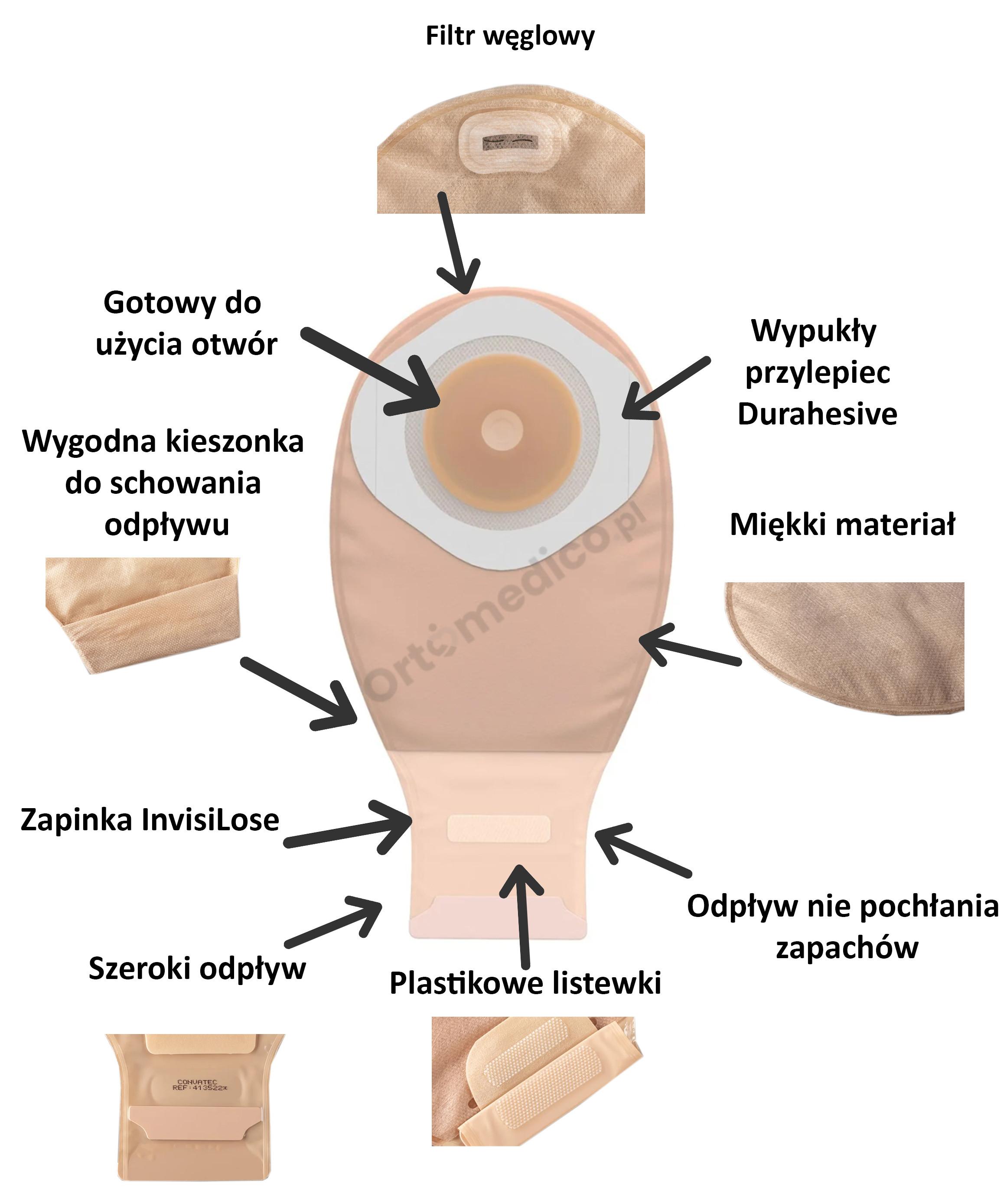 Produkt przeznaczony do zaopatrzenia ileo i kolo stomii. Ważnym aspektem w jest zastosowanie filtra zapinką invisiclose® to produkt przeznaczony dla osób bojących się o wypłynięcie treści.