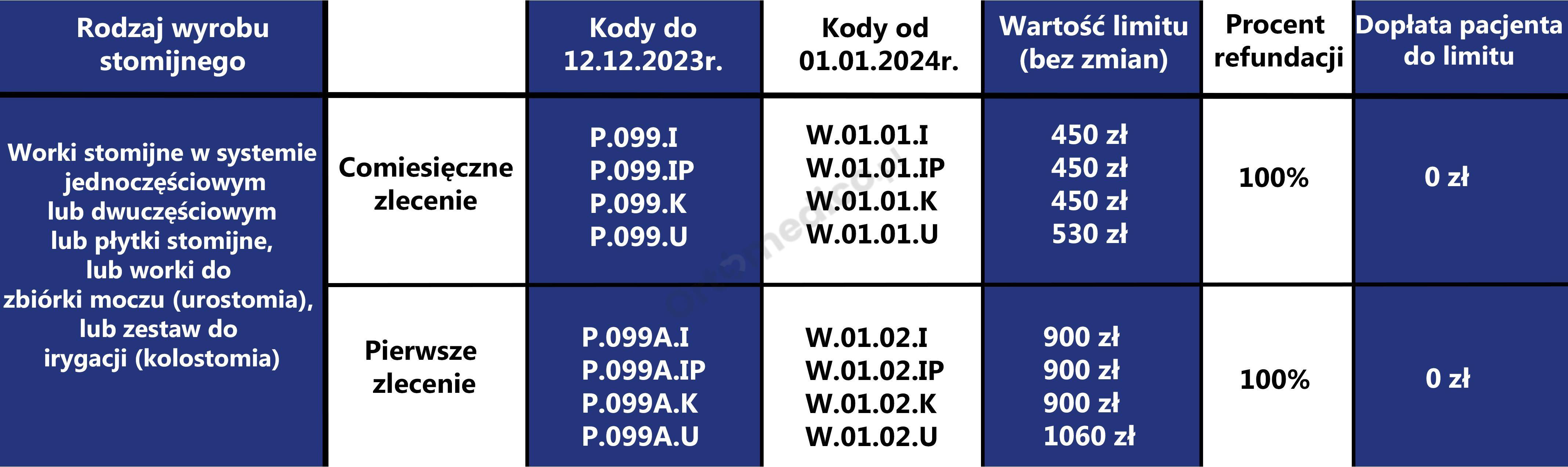 Od 1 stycznia 2023 roku zmianie uległa refundacja wyrobów stomijnych. Ustanowiono 2 zlecenia na sprzęt stomijny (P.99 worki i płytki i P.141 akcesoria) oraz osobne zlecenie (P.99.A, P.141.A) dla pacjentów nowo operowanych z podwójnym limitem. Podwyższono limity: w kolostomii i ileostomii do 450 zł ; w urostomii do 530 zł, akcesoria 120 zł w tym 20% dopłaty pacjenta. Wystawiający zlecenie będzie zlecał ryczałt lub jego część lub jego wielokrotność w przypadku pacjentów z 47ZN, 47ZND, 47DN.