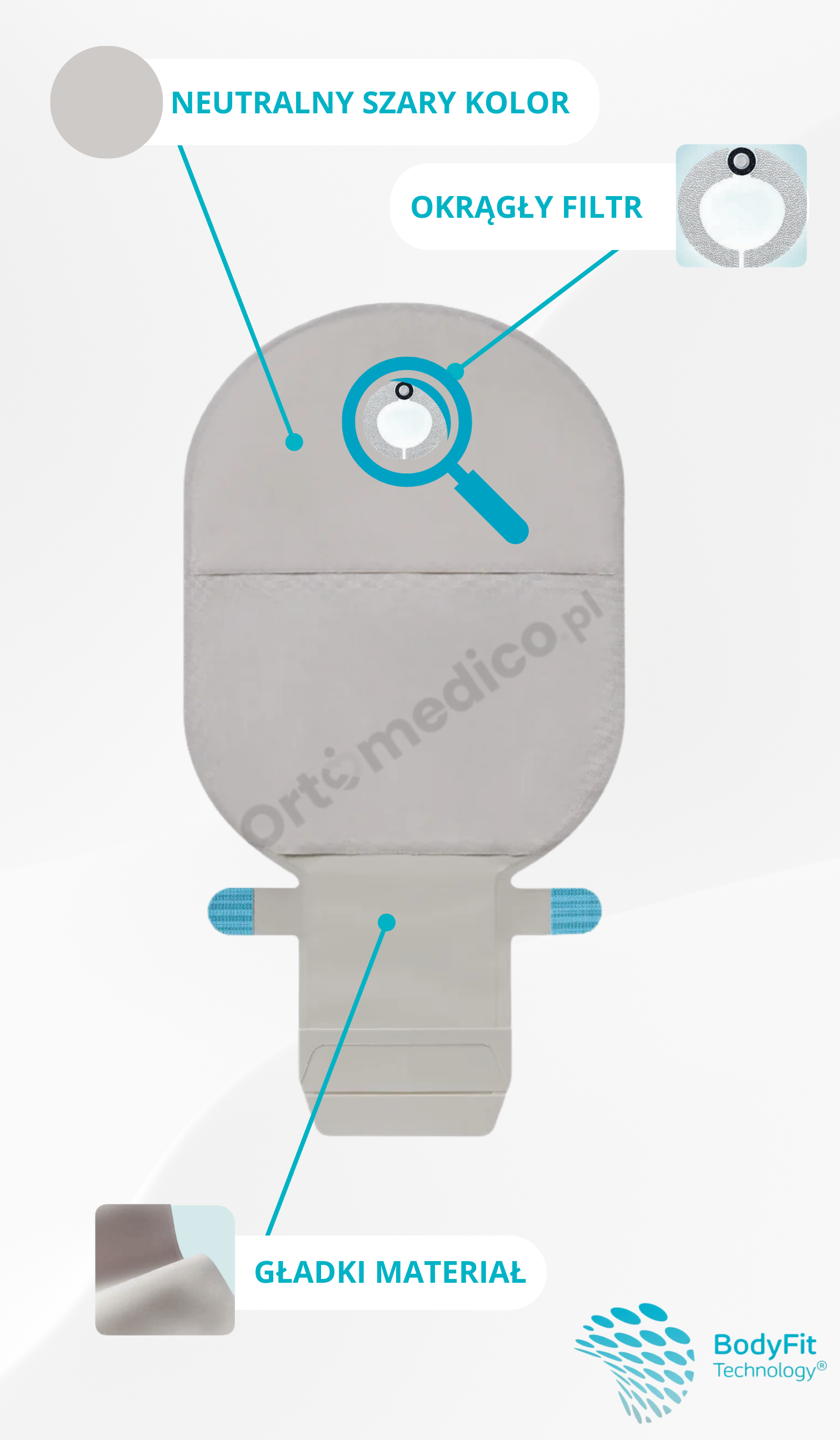 Unikatowa tkanina o nowoczesnym, neutralnym kolorze, który dopasowuje się do odcienia skóry i nie prześwituje przez odzież. W przeciwieństwie do tradycyjnych worków medycznych nie wygląda jak produkt medyczny – jest dyskretny i niemal niewidoczny pod każdym typem ubrania, nawet w jasnych kolorach. Dodatkowo jest miękki, oddychający i przyjemny w dotyku, co zwiększa komfort codziennego noszenia.
