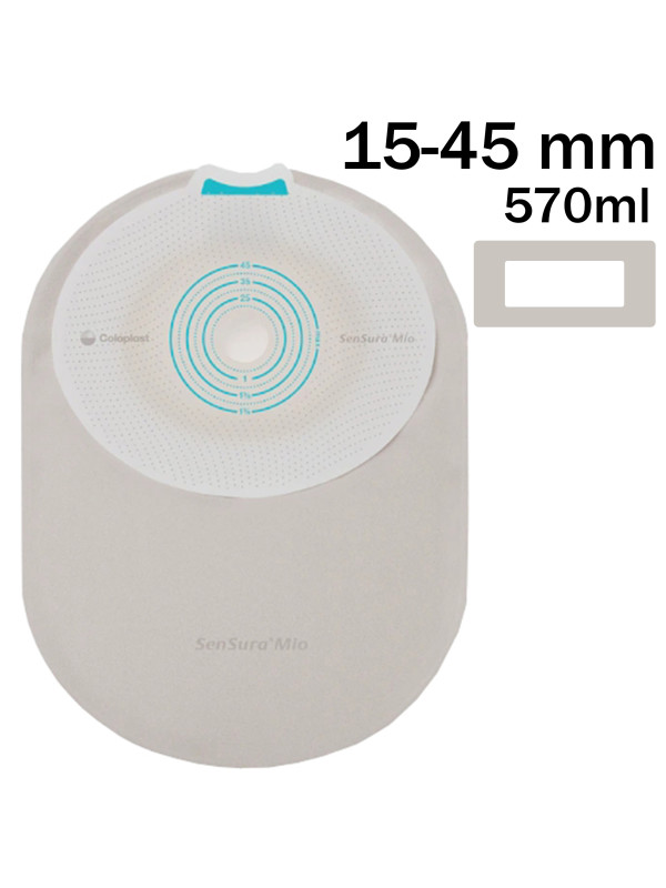 Worek Stomijny Jednoczęściowy SenSura® Mio MAXI 570 ml, 15–45 mm – Zamknięty, Naturalny Szary z Okienkiem – Coloplast (Nr kat. 108810)