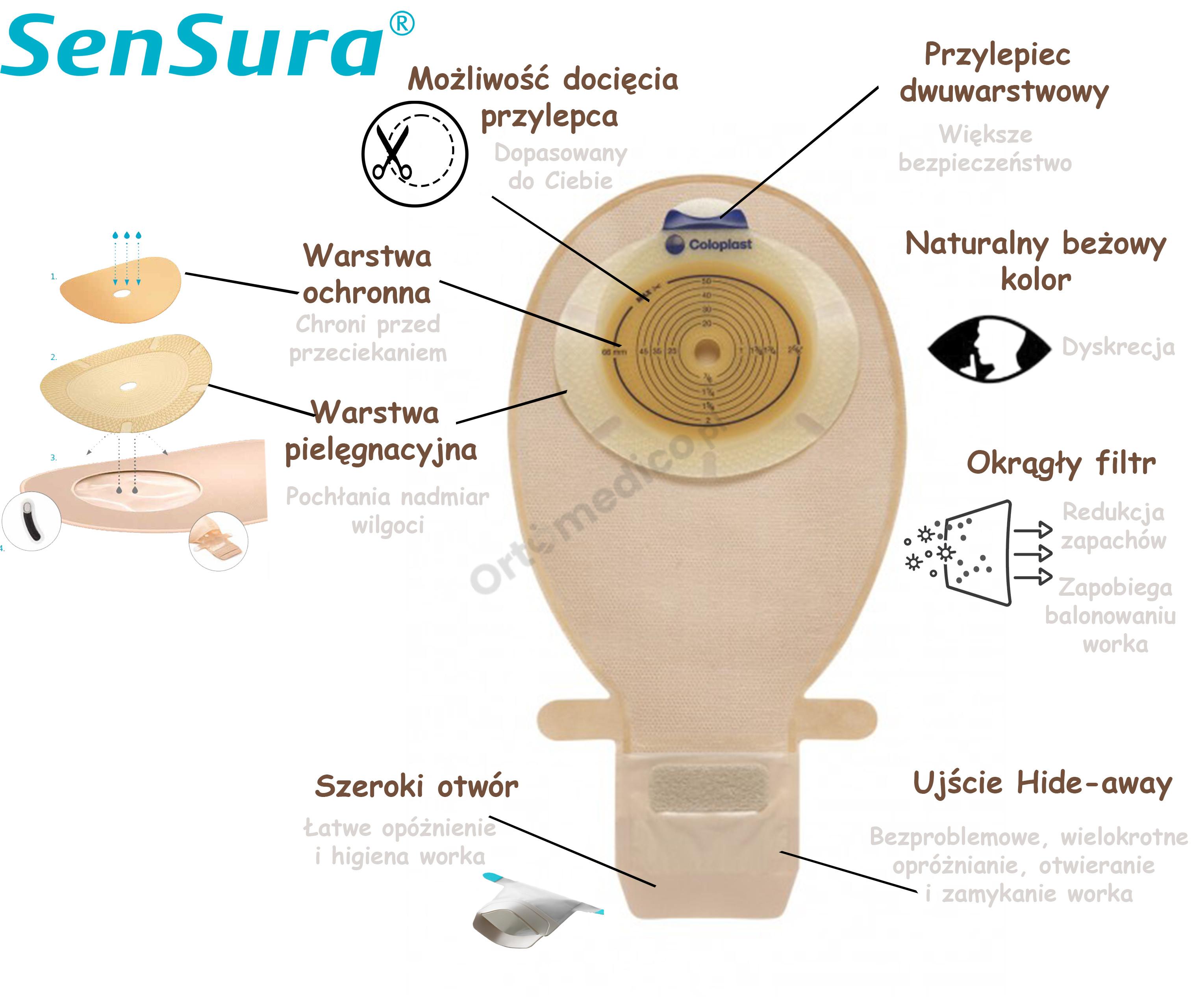 SenSura 1-częściowy worek stomijny to nowoczesne rozwiązanie, które nie tylko zapewnia maksymalne bezpieczeństwo, komfort i dyskrecję dla osób z ileostomią lub kolostomią, ale także skupia się na zachowaniu zdrowia skóry. Dzięki dwuwarstwowemu przylepkowi, elastyczności i wbudowanemu filtrowi, ten worek stomijny zapewnia nie tylko ochronę przed wyciekiem treści stomijnej, ale również utrzymuje skórę suchą i zdrową, jednocześnie neutralizując przykry zapach. Dodatkowo, funkcje takie jak ujście Hide-away i okienko kontrolne sprawiają, że jest łatwy w obsłudze i zapewniają dodatkową dyskrecję. Dostępny w różnych wariantach, oferuje idealne dopasowanie do indywidualnych potrzeb każdego pacjenta, co sprawia, że jest to niezwykle wszechstronny i skuteczny produkt.