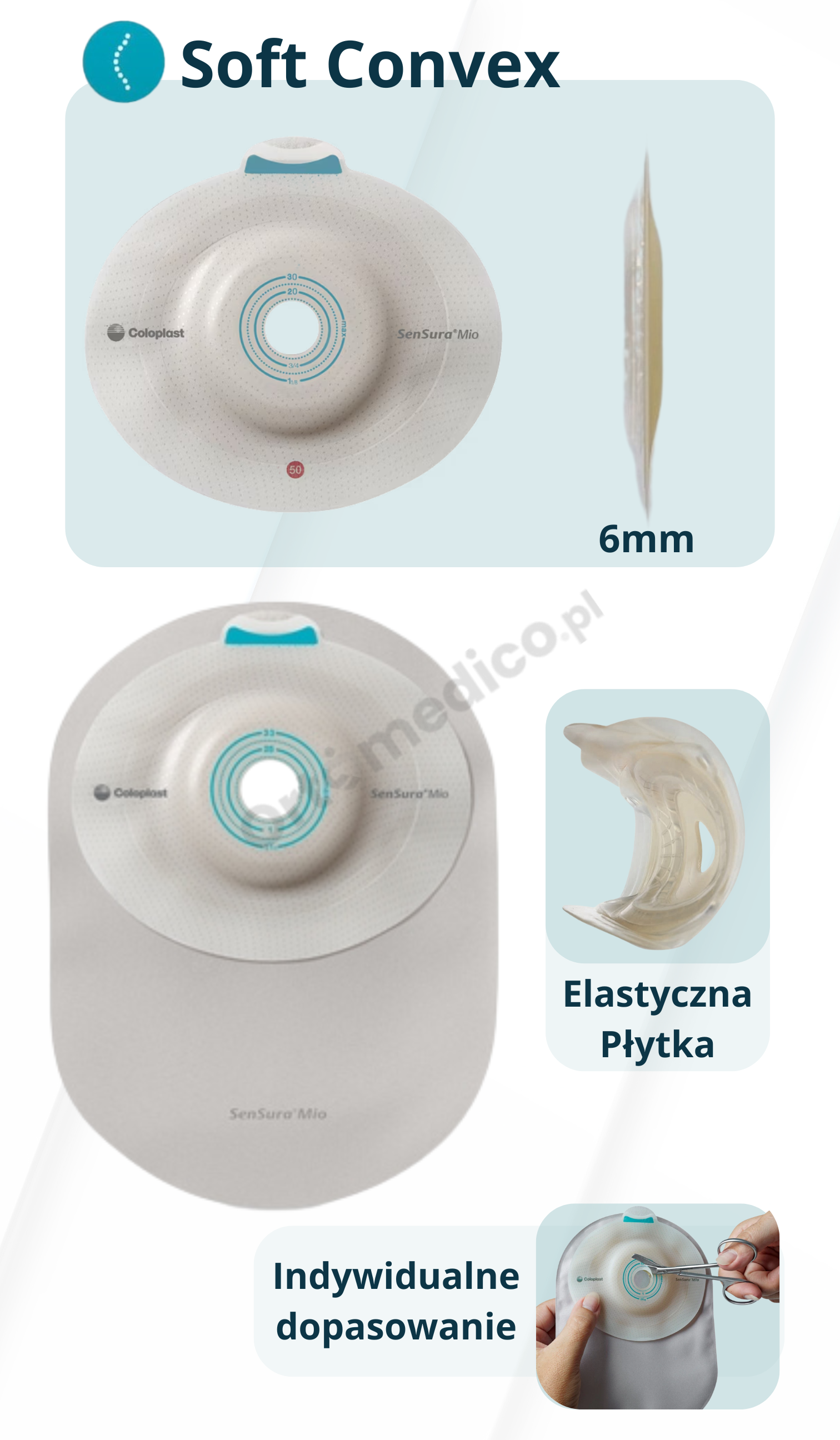 SenSura® Mio Convex Soft to specjalistyczny worek stomijny jednoczęściowy zamknięty, który został opracowany z myślą o pacjentach potrzebujących dodatkowego wsparcia w utrzymaniu szczelności i stabilności w obrębie stomii. Dzięki płytce Convex Soft zapewnia delikatny nacisk wokół stomii, unosząc ją lekko ponad powierzchnię skóry, co znacząco zmniejsza ryzyko podcieków.