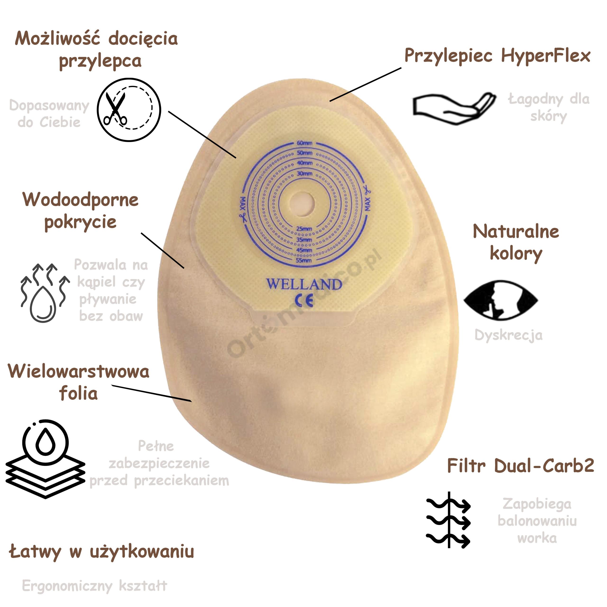 SYSTEM JEDNOCZĘŚCIOWY SAMOPRZYLEPNY FLAIR® Welland Medical to innowacyjny worek stomijny, który stanowi przełom w zaopatrzeniu kolostomii. Jego zaawansowana konstrukcja i nowoczesne materiały zapewniają użytkownikom nie tylko niezbędne bezpieczeństwo i higienę, ale również komfort i swobodę w codziennym życiu. Produkt ten został stworzony z myślą o osobach aktywnych, które nie chcą, aby stomia stanowiła dla nich ograniczenie. Dzięki zastosowaniu unikalnych rozwiązań technologicznych, takich jak udoskonalony filtr Dual-Carb2® redukujący nieprzyjemne zapachy i zapobiegający balonowaniu, czy nowoczesny przylepiec HyperFlex® z czterema hydrokoloidami, FLAIR® Welland Medical gwarantuje dyskrecję, pewność siebie i wygodę użytkowania. Worek jest łatwy w aplikacji, a jego ergonomiczny kształt wspomaga efektywne spływanie treści jelitowej, minimalizując ryzyko podciekania i podrażnień skóry. To idealne rozwiązanie dla osób poszukujących niezawodnego i dyskretnego produktu, który umożliwi im aktywne i pełne życie pomimo stomii.