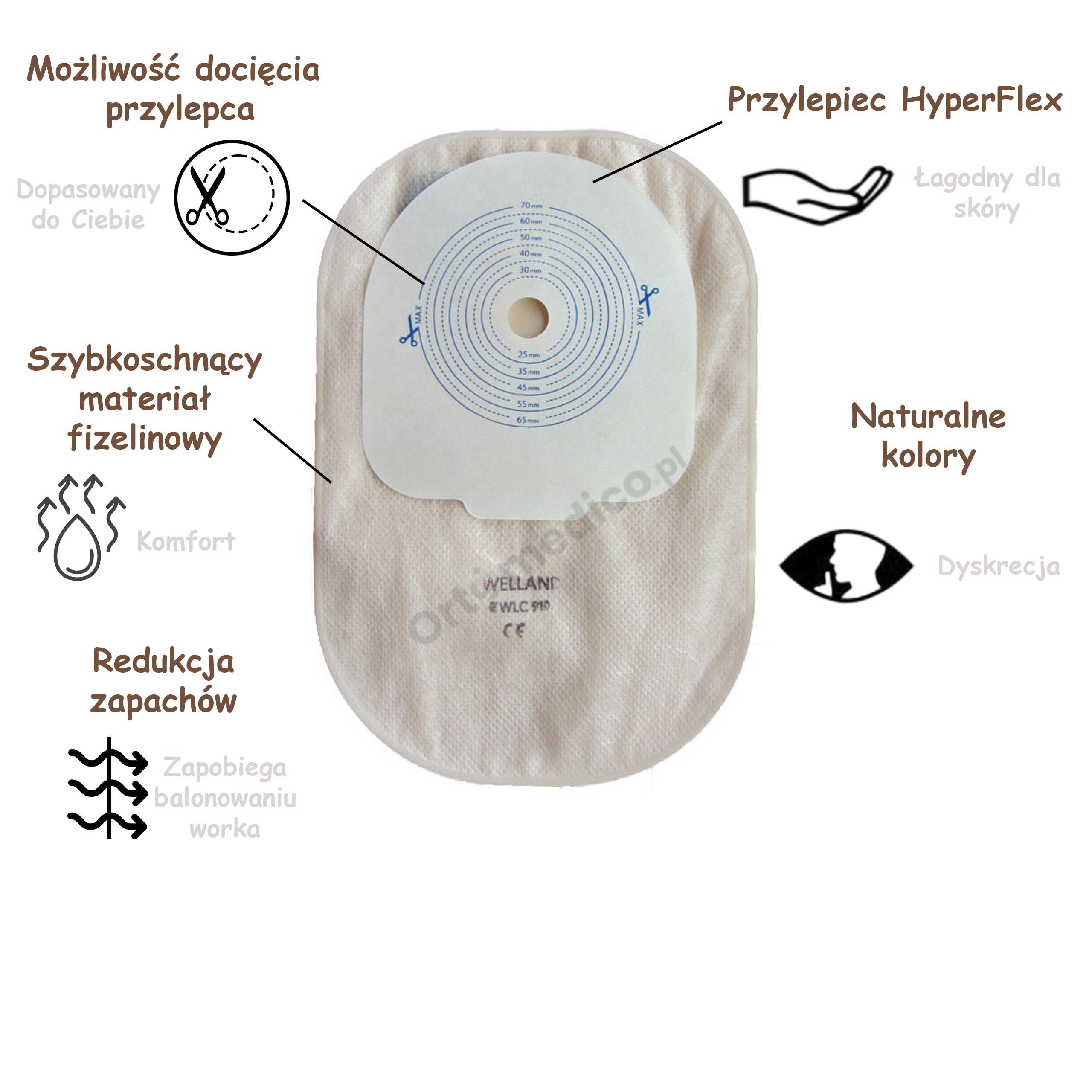 - Doskonałe Dopasowanie: Elastyczny przylepiec HyperFlex® z aż 4 hydrokoloidami idealnie przylega do ciała, zapewniając maksymalną ochronę i komfort. Możliwość docięcia przylepca do 70mm gwarantuje idealne dopasowanie do rozmiaru i kształtu Twojej stomii.