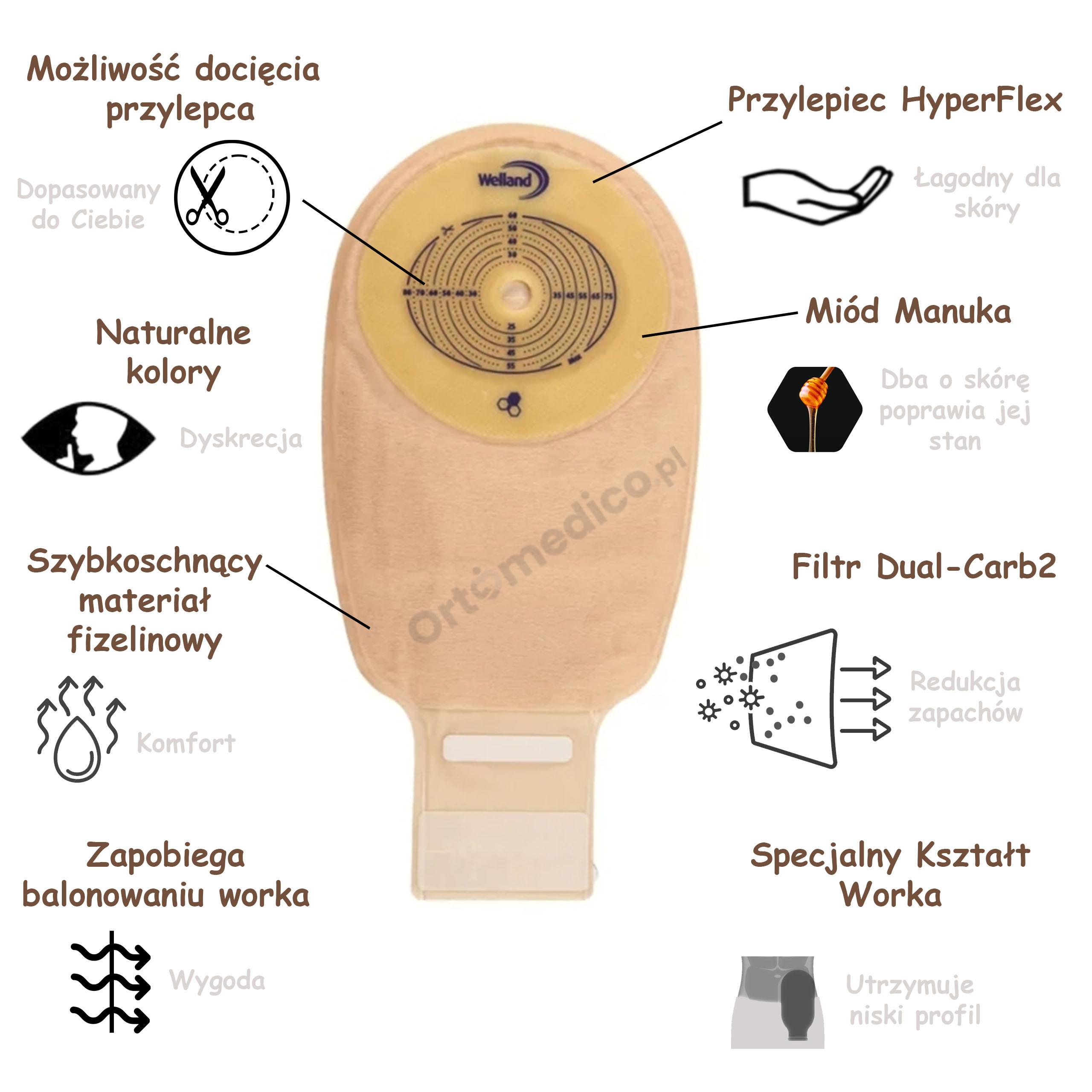 - Przylepiec HyperFlex®: Nowoczesny przylepiec wykonany z materiału HyperFlex®, zawierający aż 4 hydrokoloidy. Posiada silne właściwości gojące i ochronne, zabezpieczając skórę wokół stomii przed szkodliwym działaniem treści jelitowej. Wzbogacony o leczniczy miód Manuka, zapewnia właściwości antybakteryjne, nie odparza skóry i nie powoduje alergii.