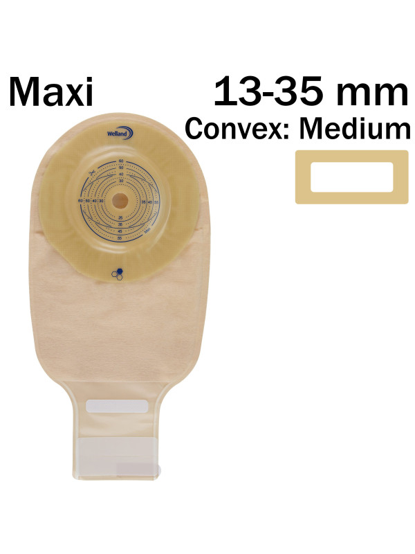 - Hydrokoloidy Hyperflex®: Baza przylepna worka, wykonana z przyjaznych dla skóry hydrokoloidów Welland Hyperflex®, zapewnia mocne i bezpieczne przyleganie do skóry wokół stomii.