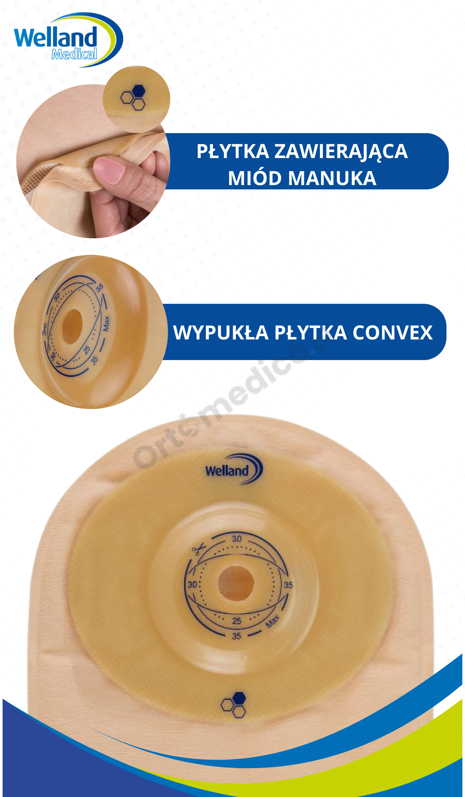 Worek stomijny Aurum® Convex firmy Welland Medical to produkt stworzony z myślą o osobach, które oczekują najwyższego poziomu ochrony skóry oraz pełnego bezpieczeństwa w codziennym życiu ze stomią. Ten jednoczęściowy worek stomijny odpływowy (drainable) w wersji MAXI łączy w sobie zaawansowaną technologię i naturalne właściwości miodu manuka, dzięki czemu skutecznie wspiera pielęgnację stomii i komfort użytkownika.